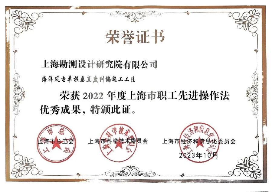 近日,在上海市總工會、市科委和市經信委聯合開展的2022年度上海市職工合理化建議和先進操作法優秀成果征集命名工作中,三峽上海院深遠海海上風電建設關鍵技術科技創新團隊(第一發明人:張權)的“海洋風電單樁垂直度糾偏施工工法”榮獲2022年度...